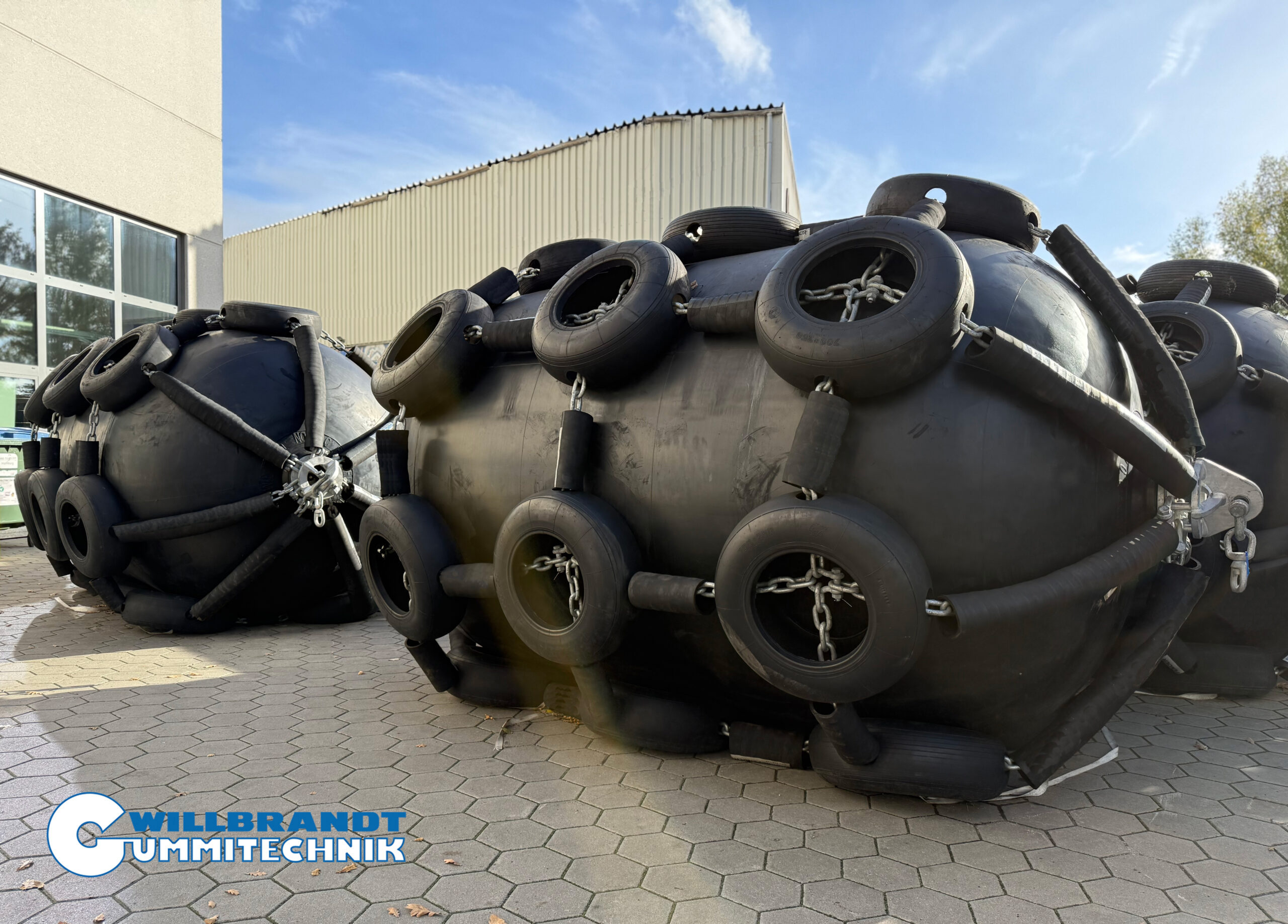 Our pneumatic fenders (2000 x 3500 mm) with robust tyre-chain netting are ready for international use …